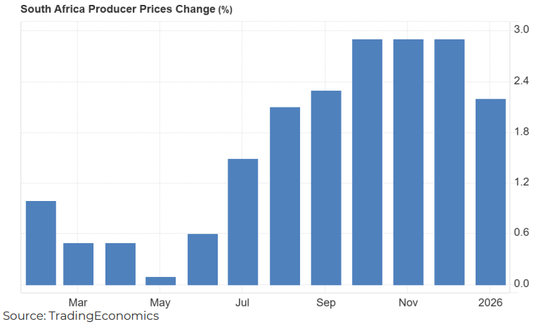 Statistics South Africa reported producer price inflation of 2.2% year-on-year in January, below expectations and driven largely by softer fuel and intermediate goods input costs. The moderation in upstream price pressures suggests limited near-term transmission into consumer inflation. However, broader macro indicators reflected uneven domestic momentum. Money supply growth slowed, private sector credit growth edged higher, and the January trade balance recorded a surplus. At the same time, National Treasury’s January cash position showed a deficit of R69.69 billion, highlighting the uneven revenue cycle and the ongoing strain of financing government operations between peak tax collection periods.