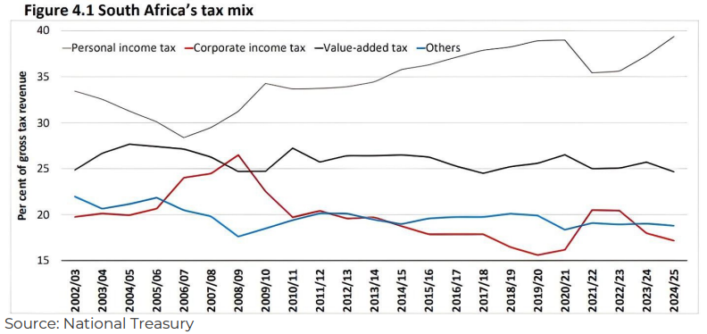 Government withdrew the R20 billion tax increase that had been provisionally built into the May 2025 budget, after revising expected gross tax revenue for 2025/26 up by R21.3 billion and lifting the tax-to-GDP ratio to 25.9%. The budget speech attributed the improved in-year outlook mainly to stronger net value-added tax, corporate income tax, and dividends tax receipts, which created scope to avoid additional tax measures without, in government’s framing, undermining fiscal sustainability or near-term economic activity. Personal income tax brackets and medical tax credits were fully adjusted for inflation, reversing two years of partial relief, while a range of thresholds and limits were raised to support small businesses and household saving. The package leans heavily on revenue resilience and compliance gains to absorb spending pressures.