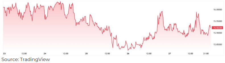 The rand strengthened from R16.01 on Monday’s open to R15.92 on Friday’s close [-0.56%].