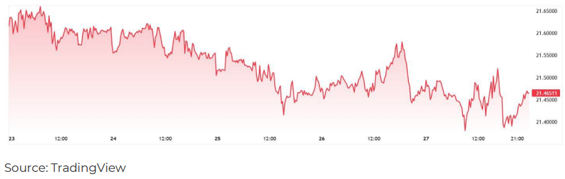 The rand strengthened from R21.61 on Monday’s open to R21.47 on Friday’s close [-0.65%].