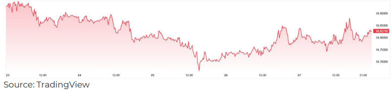 The rand strengthened from R18.93 on Monday’s open to R18.83 on Friday’s close [-0.53%].