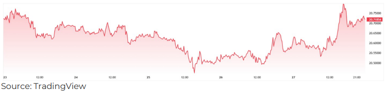 The rand strengthened from R20.73 on Monday’s open to R20.72 on Friday’s close [-0.05%].