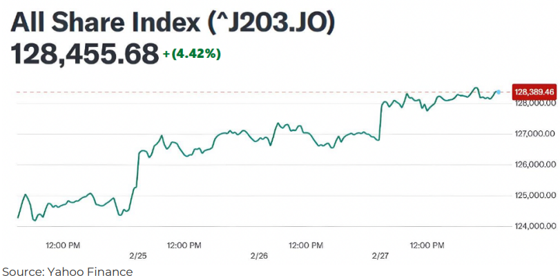The FTSE/JSE All Share Index [J203] rose 4.42% this week, closing at 128,455.68 on Friday after opening at 123,022.00 on Monday.