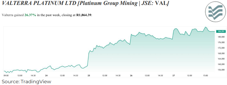 The FTSE/JSE Mining Index closed Friday at 183,530.30, up 11.26% from Monday’s open.