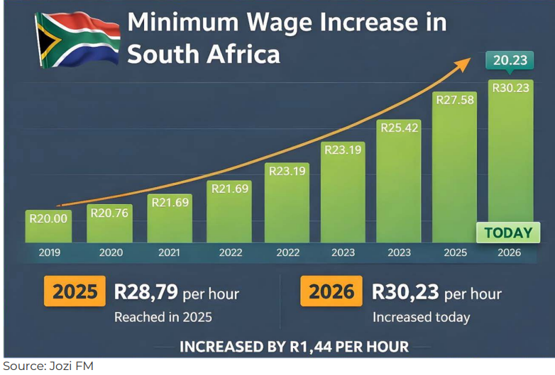 The South African Government confirmed that the national minimum wage will rise to R30.23 per hour from 1 March 2026, following its gazettement by the Department of Employment and Labour. The adjustment applies across key sectors, including farm and domestic work, and updates several sectoral determinations. The change reflects ongoing cost-of-living pressures and government efforts to ease income strain for low-paid workers. Employers are likely to absorb higher labour costs incrementally, while its broader impact on formal employment and consumer demand remains closely watched by economists.